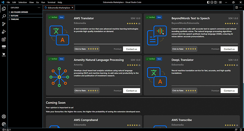 The Marketplace is fully integrated into the the Premium version of the VSIDE developers’ environment. Some plugins and connectors can be installed directly from the catalog page. For more complex solutions you can click to send a request.