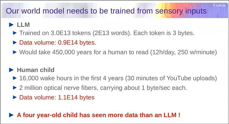 In a Harvard address LeCun points out that, in its first four years of life, a child receives an amount of visual information that exceeds the volume of data used to train the largest modern LLMs.